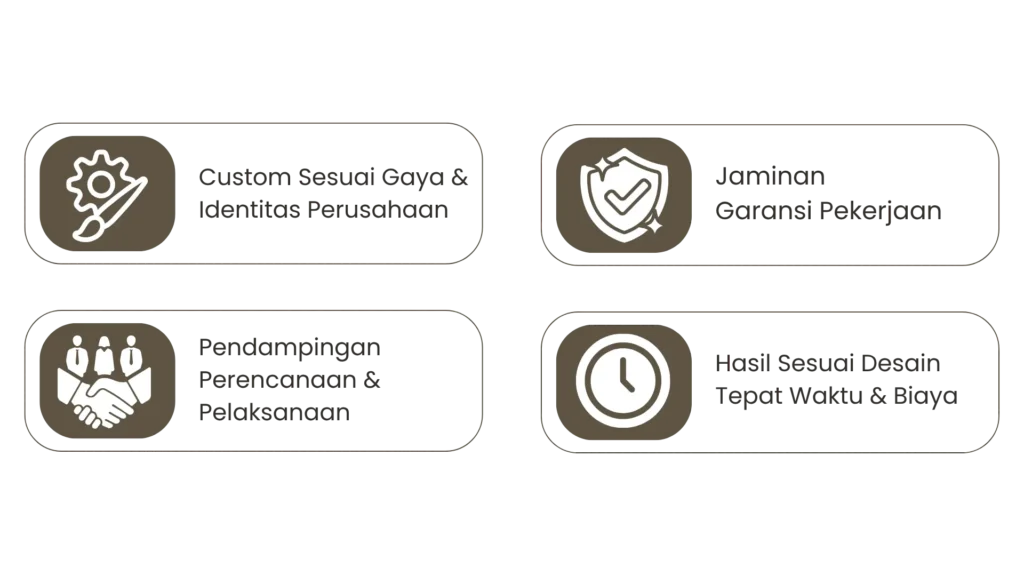 Bantu wujudkan ruang kerja ideal Anda – mulai dari desain, produksi, hingga instalasi. Spesialis interior kantor formal, kreatif, dan industrial, custom sesuai visi bisnis Anda.